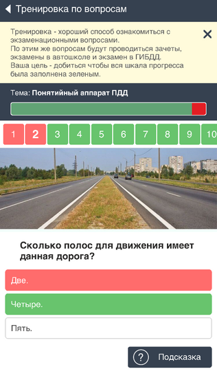 При решении билета вы можете выбрать номер вопроса в верхнем списке. Также доступна кнопка «Подсказка», которая содержит описание верного ответа. Подсказка будет показана автоматически, если вы дадите неверный ответ.
